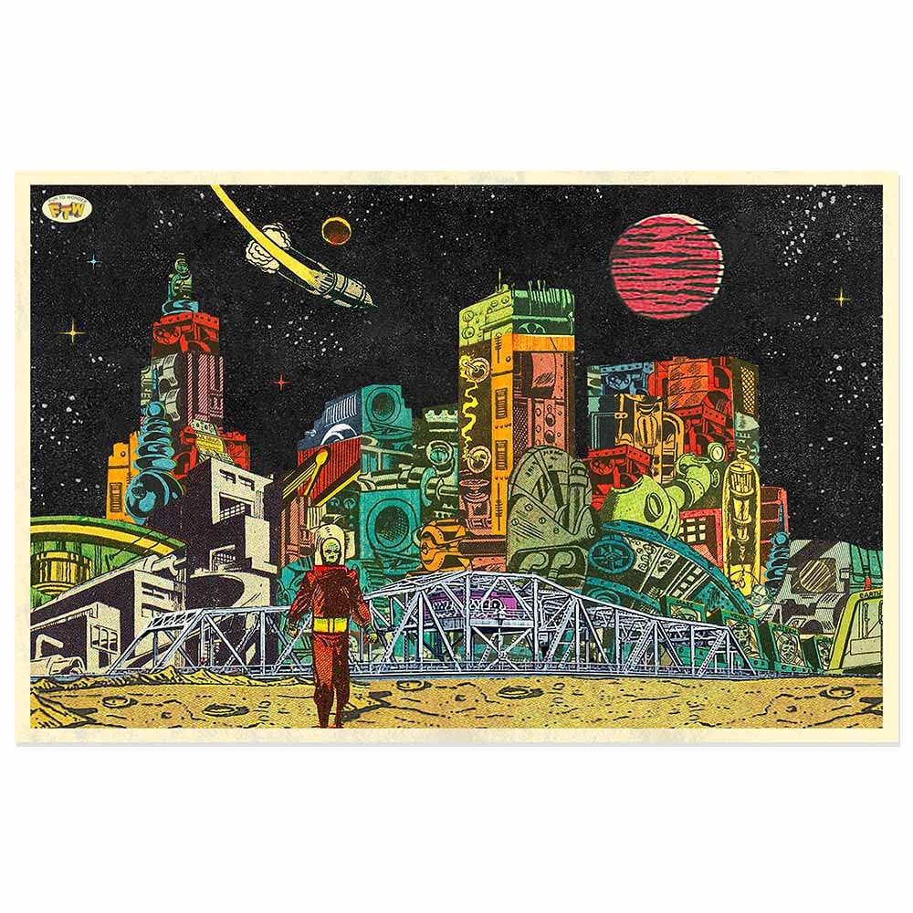 The glowing city buzzes, hums, and crackles on the horizon. A lone figure approaches cautiously to offer refuge from the barren windswept plains.